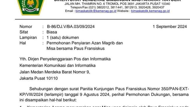 Jakarta - Kementerian Agama (Kemenag) menyurati Kementerian Informasi dan Informatika (Kominfo). Surat itu berisi permohonan agar stasiun televisi berkenan menyiarkan azan dalam bentuk running text saat menayangkan secara langsung ibadah misa yang dipimpin Paus Fransiskus di Stadion Utama GBK.