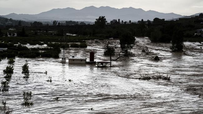Jakarta - Guardia Civil, satgas sipil Spanyol menyelamatkan seorang anak yang terjebak banjir bandang di Kota Alora, Malaga. Aksi penyelamatan tersebut dilakukan pakai helikopter.