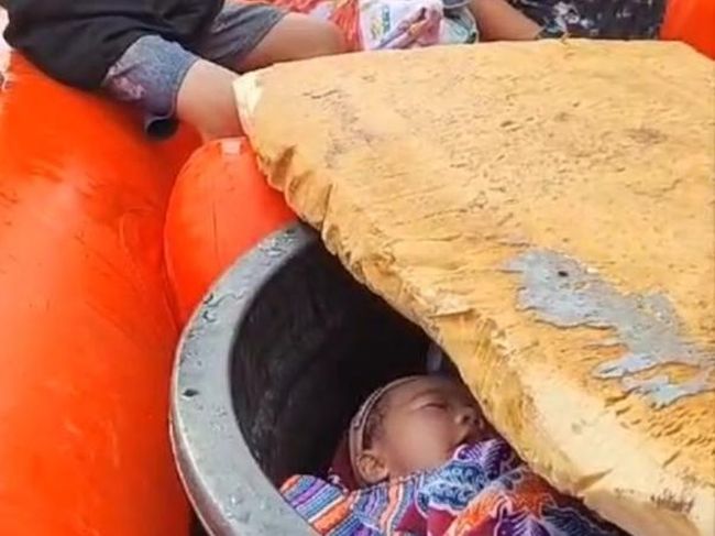 Dilihat detikcom dari video, Selasa (26/11/2024), bayi tersebut diletakkan di dalam ember plastik hitam yang dibawa menggunakan perahu karet. Ia tampak menggunakan kaos kaki dan celana panjang, diselimuti dengan kain gendong batik.