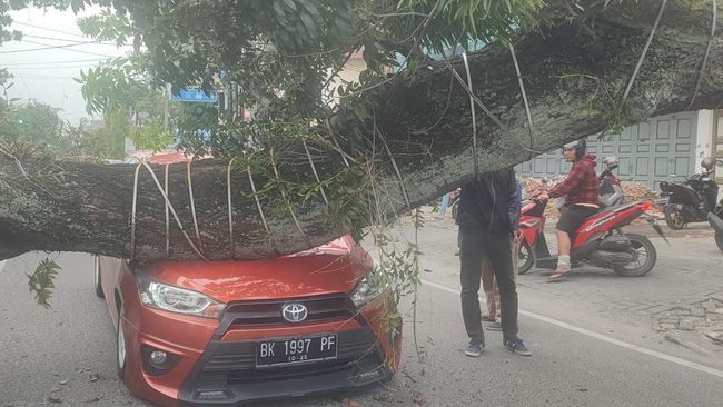 "Pada saat saya melintas di depan lagi macet, tadi sempat dengar suara dari pohon yang tumbang tadi, saya mau maju tak bisa karena ada kendaraan di depan, mau mundur pun tak sempat, jadi pohonnya tumbang mengenai kap depan (mobil)," kata Nafizada, Minggu (15/12/2024).