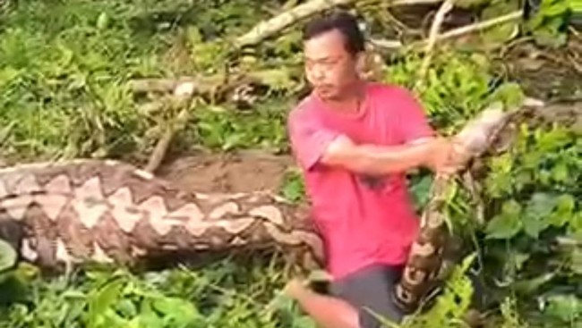 Dalam video beredar, tampak pria berbaju merah menangkap ular piton seorang diri. Pria tersebut memegang kepalanya dengan kedua tangannya agar tidak menyerang.