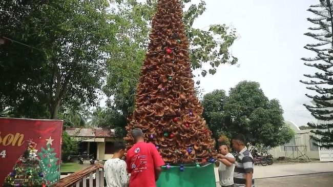 Pemandangan unik menghiasi Gereja Kristen Protestan Indonesia (GKPI) Kisaran Kota, Kabupaten Asahan, Sumatera Utara, saat perayaan Natal 2024. Hal itu lantaran ada sebuah pohon Natal yang terbuat dari limbah sabut kelapa setinggi 7 meter berdiri megah di gereja tersebut.
