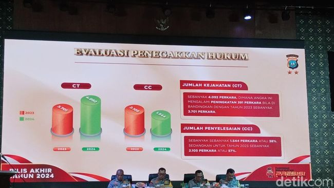 "Polda Kepri mencatat lonjakan jumlah tindak pidana kejahatan mencapai 4092 kasus. Jumlah penyelesaian kasus ada 1.544 perkara atau sebesar 38 persen," kata Kapolda Kepri, Irjen Yan Fitri Halimansyah, Senin (30/12/2024).