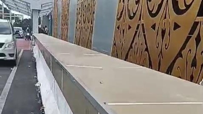 Dalam video yang dilihat, Senin (6/1), bagian yang rusak itu terdapat di bagian sisi tembok jalan. Material yang rusak itu adalah aluminium composite panel (ACP) terlepas dari tempatnya.