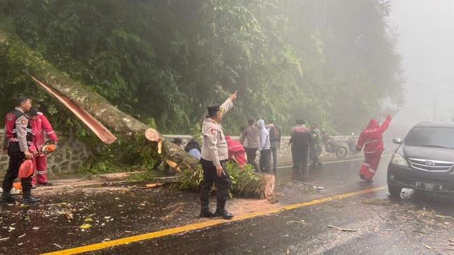 "Pohon besar yang tumbang tidak hanya menutup jalur lalu lintas, tetapi juga menimpa kabel listrik, menyebabkan antrean kendaraan di kedua arah. Beruntung, tidak ada korban jiwa dalam kejadian ini," kata AKBP Eko Yulianto, Sabtu (11/1/2025).