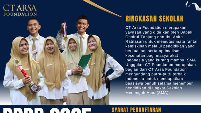 SMA Unggulan CT Arsa Foundation di Deli Serdang, Sumatera Utara (Sumut), membuka Pendaftaran Penerimaan Siswa Baru (PPDB) Tahun Ajaran 2025/2026. Sekolah ini menawarkan pendidikan gratis 100%.
