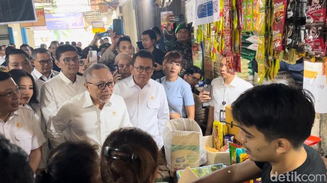 Zulhas didampingi Menteri Perdagangan Budi Santoso, Pj Gubsu Agus Fatoni, Wali Kota Medan Bobby Nasution. Mereka berkeliling kios sayur mayur, daging, telur, dan bahan sembako.