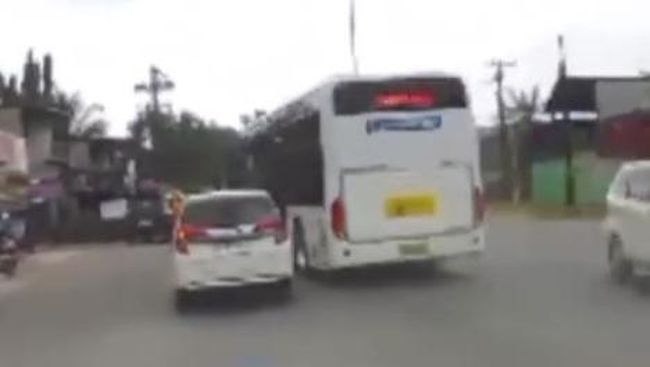 Akibatnya, mobil yang disalip tersebut ngerem dan mengarahkan mobilnya ke sisi kiri agar tidak menabrak Bus listrik. Bus listrik itu terlihat tetap melaju tanpa peduli dengan peristiwa membahayakan pengendara lain itu.