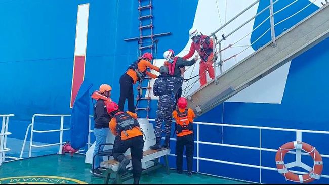 Dia tampak dipegang beberapa petugas saat dibawa turun ke kapal SAR. Setelah proses evakuasi, kapal tanker tersebut melanjutkan pelayaran.