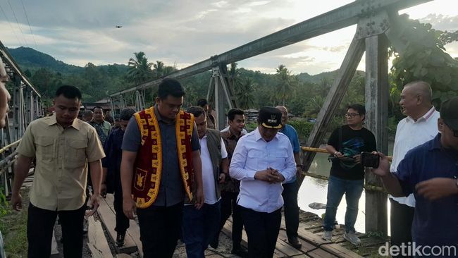 Dalam catatan detikSumut, Bobby meninjau jembatan yang membelah Sungai Noyo ini pada Sabtu (2/11/2024). Saat itu Bobby berjalan di atas jembatan yang dialasi papan dan balok itu.