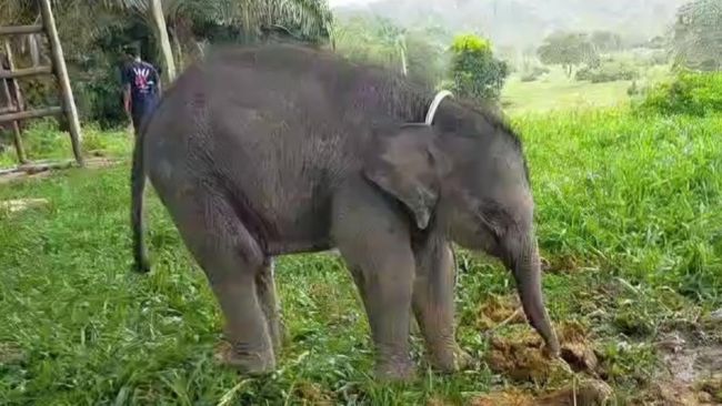Kabar yang menggembirakan adalah saat ini gajah sudah mulai belajar makan daun dan bekas kotoran gajah binaan. Artinya kondisi gajah menunjukkan perkembangan baik tanpa indukan.