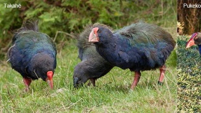 Diperkirakan burung ini telah punah sejak akhir tahun 1800-an hingga tiba-tiba ditemukan kembali pada tahun 1948. Burung ini juga memiliki karakter yang berwarna-warni, dengan bulu berwarna biru dan hijau cerah serta paruh berwarna merah. Takahe memiliki umur yang sangat panjang hingga 20 tahun.