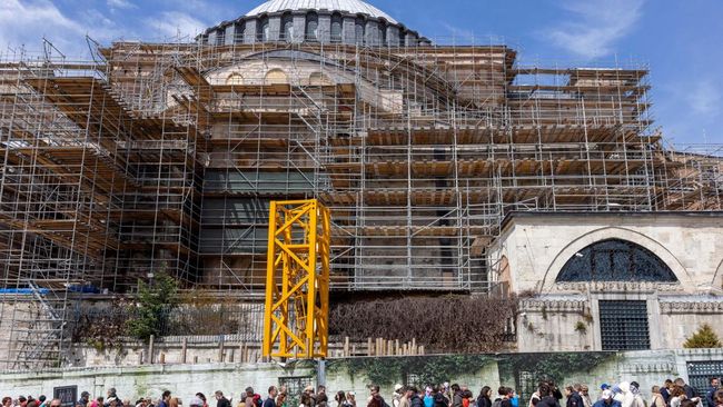 Bangunan ikonik yang juga kini difungsikan sebagai masjid di Istanbul, Hagia Sophia, saat ini sedang menjalani proses renovasi besar. Proyek ini bertujuan untuk mengembalikan kemegahan arsitekturnya serta meningkatkan ketahanannya terhadap potensi gempa di masa mendatang.