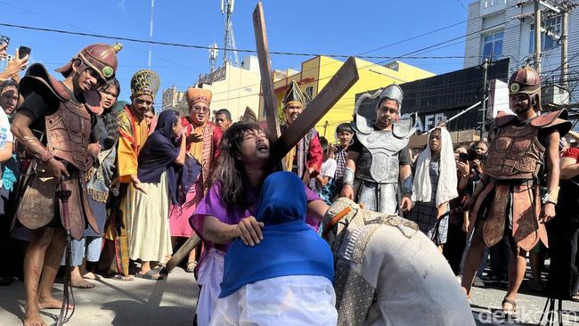 Berdasarkan pantauan detikSumut, Jumat (18/4/2025), sejumlah pemeran menggunakan kostum mulai untuk memerankan Yesus, bandit, Maria, Simon, dan lainnya. Ada 14 perhentian yang menggambarkan peristiwa penyaliban Yesus.