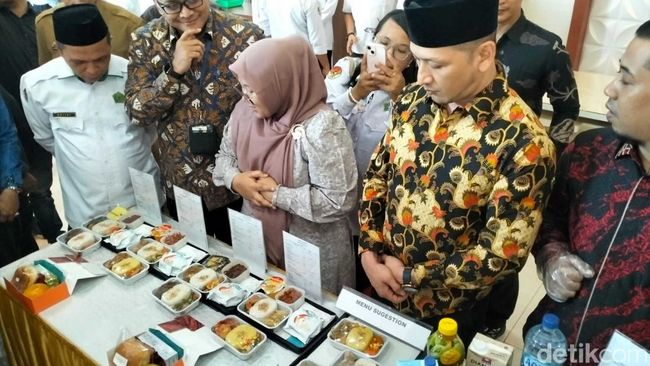 Berbagai jenis menu yang akan disajikan ke jemaah dihadirkan saat uji coba yang berlangsung di Asrama Haji Embarkasi Aceh di Banda Aceh, Selasa (22/4/2025). Plt Sekda Aceh M Nasir Syamaun, Kakanwil Kemenag Aceh Azhari ikut melihat langsung menu yang sudah dikemas.