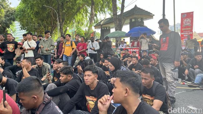 Berdasarkan pantauan detikSumut, Kamis (1/5/2025) ratusan massa aksi tiba pukul 14.30 WIB. Mereka tampak duduk lesehan di ruas jalan.