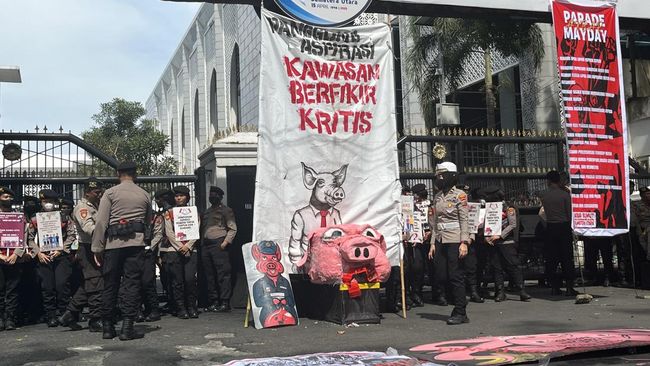 Berdasarkan pantauan detikSumut, Kamis (1/5/2025), ada beberapa properti demo mulai dari replikas kepala babi ataupun lukisan babi gurita yang dibawa Aliansi Akumulasi Kemarahan Buruh dan Rakyat Bersatu (AKBAR) Sumut.