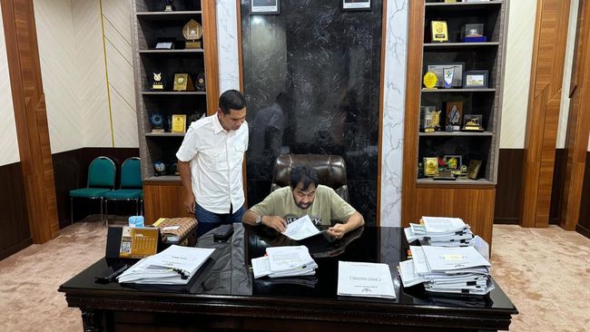 Dalam foto tampak Mualem mengenakan baju kaos tengah meneken salah satu dokumen. Di mejanya terlihat tumpukan dokumen maupun surat yang harus ditandatanganinya.