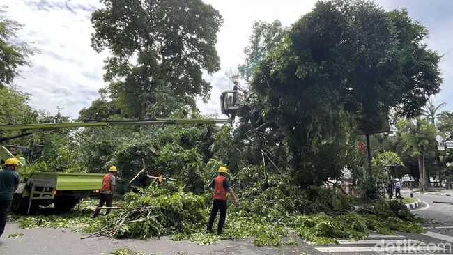 Berdasarkan pantauan detikSumut, Selasa (10/6/2025), kondisi sebagian badan Jalan Sudirman menuju Jalan Slamet Riyadi ditutup. Beberapa petugas tampak memotong batang-batang pohon yang mengenai gedung Kantor Pos Medan.