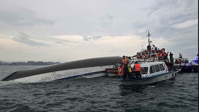 Kapal Wonder Sea di Ha Long Bay terbalik pada Sabtu (19/7/2025) sore. Kapal itu membawa 48 penumpang dan 5 awak dalam perjalanan keliling situs warisan dunia UNESCO tersebut.