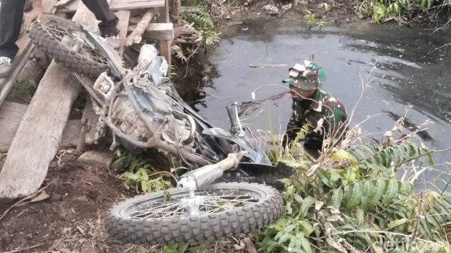 "Saat itu kaki saya tidak sampai ke ujung papan/jembatan tersebut. Sehingga saya jatuh ke dalam parit yang kedalaman 1,5 meter dan motor pun ikut jatuh," katanya.