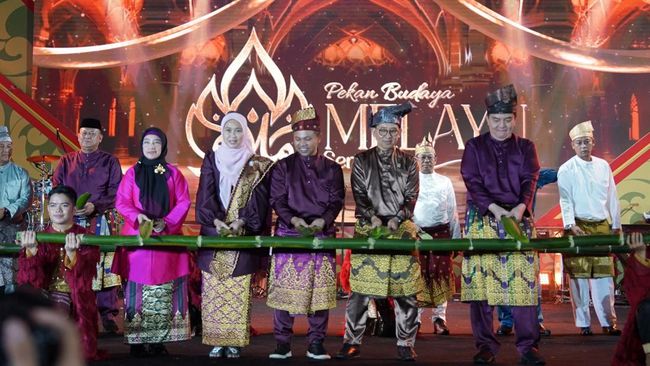 Sebagai mantan Kapolda Riau, Komjen M Iqbal hadir dengan baju Melayu berwarna ungu. Bahkan, Iqbal terlihat pakai setelan lengkap seperti tanjak dan songker khas warna keemasan.