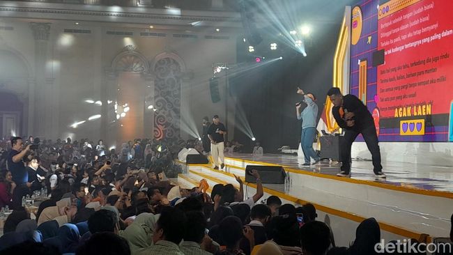 Pantauan detikSumut, Kamis (21/8/2025), Agak Laen menghibur peserta setelah istirahat makan siang. Agak Laen terlihat membawa sejumlah lagu di momen ini.