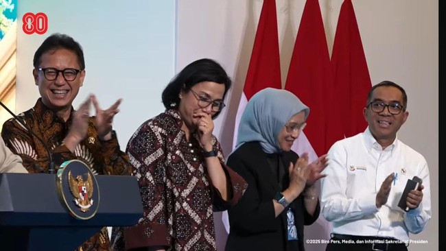 Jakarta - Menteri Keuangan Sri Mulyani merayakan ulang tahun ke-63. Prabowo memberikan ucapan selamat saat peresmian RS PON Mahar Mardjono. Begini ekspresi Menkeu.