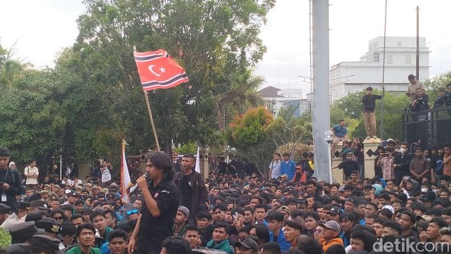 Pantauan detikSumut, setelah sejam berorasi di jalan, massa diperbolehkan masuk hingga ke depan tiang bendera di halaman gedung DPRA, Senin (1/9/2025). Massa duduk dengan tertib lalu berorasi secara bergantian.