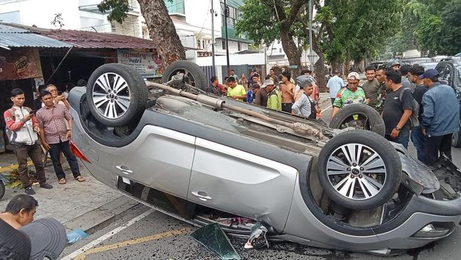 Satu unit mobil mobil terbalik di Jalan Putri Hijau, Medan. Pengendara mobil itu kemudian dilarikan ke Rumah Sakit Putri Hijai, yang lokasinya tidak jauh dari tempat mobil terbalik.