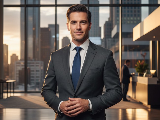 - Tambahkan jas hitam dengan sentuhan bahu yang tegas dan dasi biru dongker solid pada orang ini, menciptakan kesan profesional dan berwibawa.