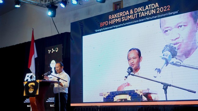 Sebelumnya Ketua Umum BPD HIPMI Sumut Ade Jona Prasetyo menyambut Menteri Bahlil dengan pantun.