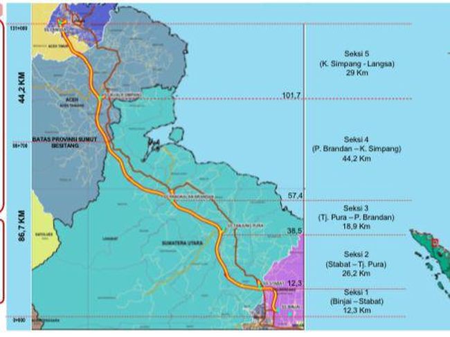 Kemudian pada seksi 3 untuk ruas Tanjung Pura-Pangkalan Brandan sepanjang 18,9 km ditargetkan beroperasi pada Desember 2023 dengan realisasi fisik saat ini sebesar 44,9 persen.