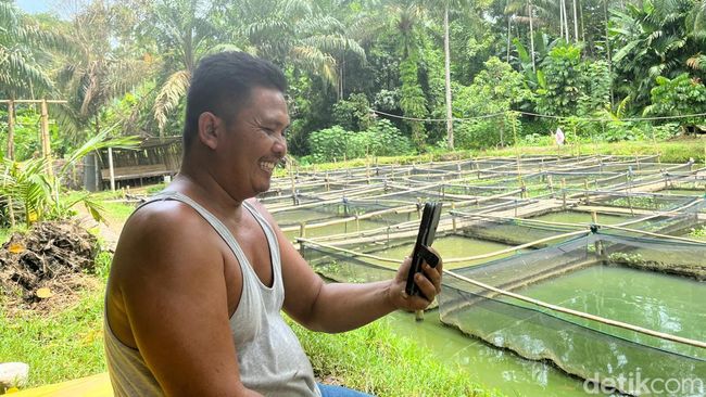 Siang itu, Edi Ismanto (54) bersama warga setempat menebar pelet untuk ikan lele yang berada di keramba pada Minggu (13/10/2024). Di sela-sela kesibukan itu, Edi bergegas menuju kursi bambu di pinggir keramba untuk menghubungi istrinya.
