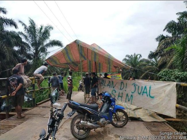 Warga Desa Sungai Gelam melakukan pemblokiran akses jalan di lintas Petaling Kabupaten Muaro Jambi, Jambi karena kondisinya rusak parah. Bahkan warga sampai membentang spanduk 'Jalan Dijual' di lokasi.