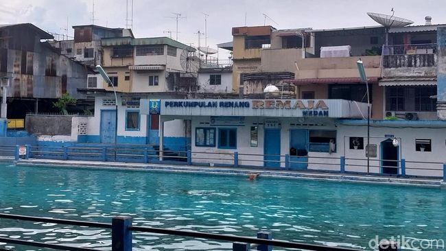 Tampak, kolam itu bernuansa putih biru. Di samping kanan kolam tampak ada tulisan 'Perkumpulan Renang Remaja Medan'.