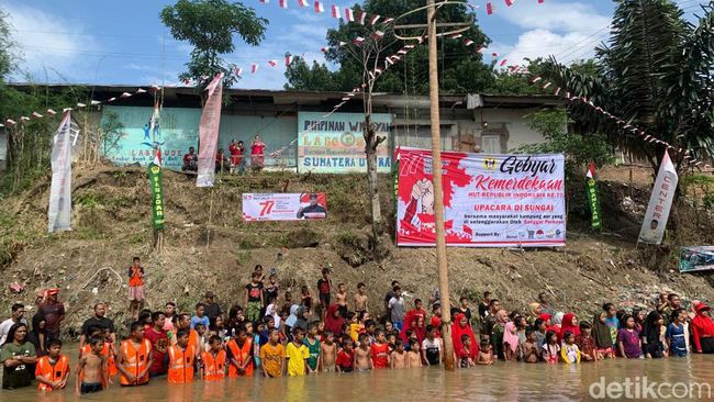 Medan - Warga Kampung Aur Medan melaksanakan Upacara HUT ke 77 RI di atas Sungai Deli. Mereka antusias turun ke sungai untuk mengikuti upacara.