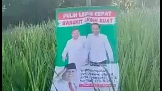 Poster Prabowo dan Jokowi di Madura. Di poster itu terdapat foto di Prabowo sedang berjalan bersama Presiden RI Joko Widodo dengan komposisi Prabowo di kanan, Jokowi di kiri. Terdapat juga slogan 'Pulih Lebih Cepat, Bangkit Lebih Kuat'. (Tangkapan Layar)