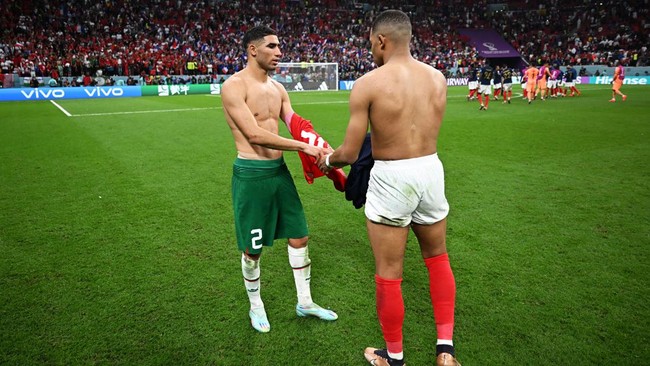 Medan - Kylian Mbappe dan Achraf Hakimi bertukar jersey usai duel Maroko vs Prancis tuntas. Kedua pemain PSG itu memang dikenal dekat dan memiliki hubungan baik.