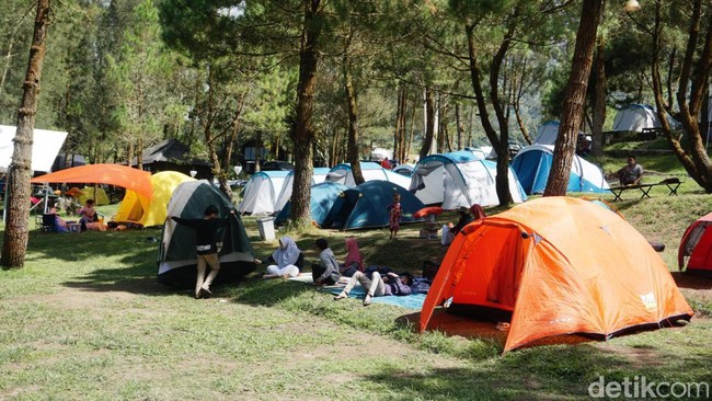 Wisatawan sedang bertenda diliputi beberapa pohon pinus di Villa Maripro Lau Kawar. (Goklas Wisely/detikSumut)