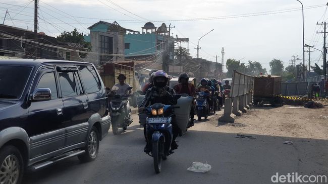 Jalan yang menyempit akibat adanya proyek galian di kawasan Kampung Lalang. Hal ini yang menjadi pemicu kemacetan parah di sana pada Senin (27/3) kemarin. (Goklas Wisely/detikSumut)