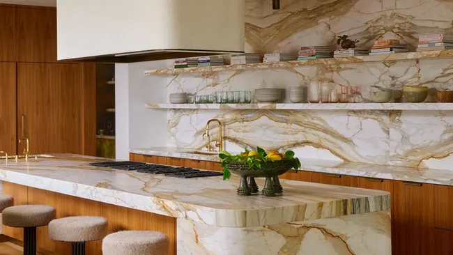 Dapur rumah Jhon Legend terlihat begitu mewah dengan marmer bercorak coklat. (Foto: Dok. Architectural Digest/Yoshihiro Makino)