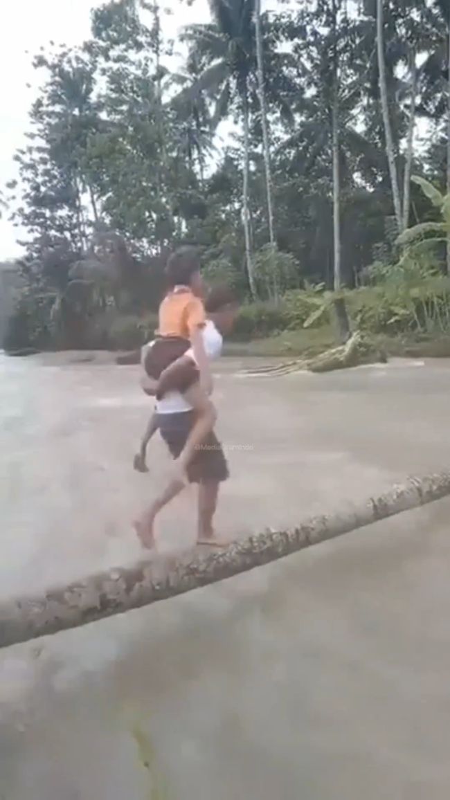 Nias Selatan - Murid SD di Nias Selatan menyeberangi sungai dengan bantuan batang kayu. Begini momennya.