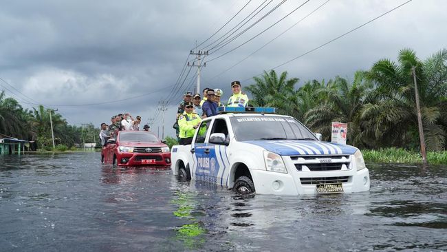 Pelalawan - Kapolda Riau Irjen Mohammad Iqbal mengecek banjir di jalan lintas timur, Pelalawan, Riau. Selain cek banjir, Kapolda juga memberikan bantuan kepada warga.