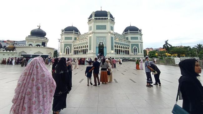 Medan - Ratusan warga padati Masjid Raya Al-Mashun Medan untuk tunaikan salat Idul Adha. Suara takbir terdengar dari warga dan pihak rombongan Kesultanan Deli.