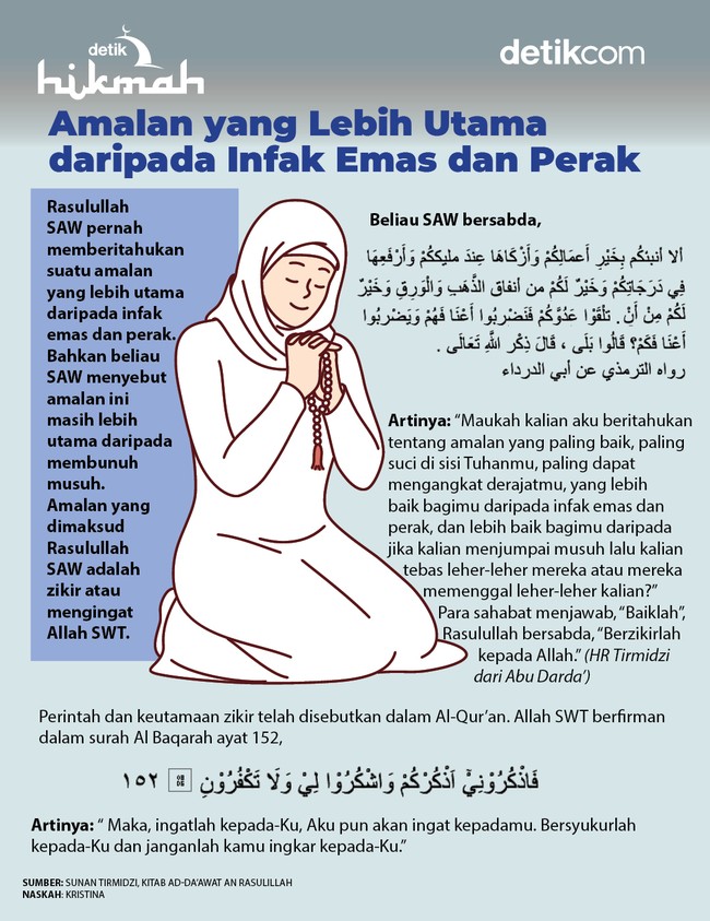 Jakarta - Ada amalan yang lebih utama dari infak emas dan perak atau membunuh musuk. Berikut ini penjelasannya.