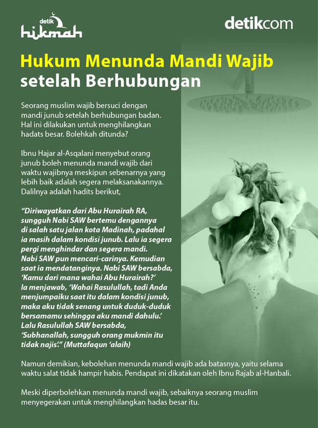 Jakarta - Menghilangkan hadats setelah berhubungan badan yakni mandi junub. Lalu bagaimana jika pasangan suami istri ketika menunda mandi junub usai berhubungan badan?