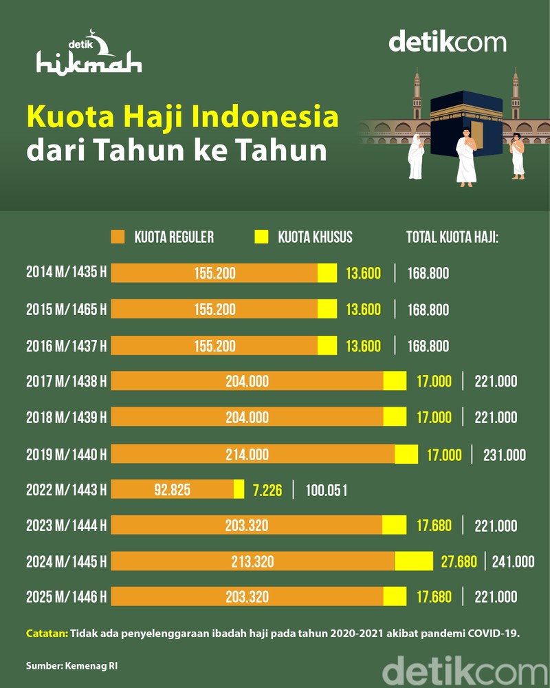 Perbandingan Kuota Haji Indonesia dari 2014-2025 BAGIKAN URL telah disalin Dalam catatan dari tahun 2014 hingga 2025, ada perbedaan jumlah kuota haji Indonesia. Berikut rinciannya jumlahnya dari tahun ke tahun yang dilansir dari laman Kemenag RI. (Foto: Andhika Akbarayansyah)