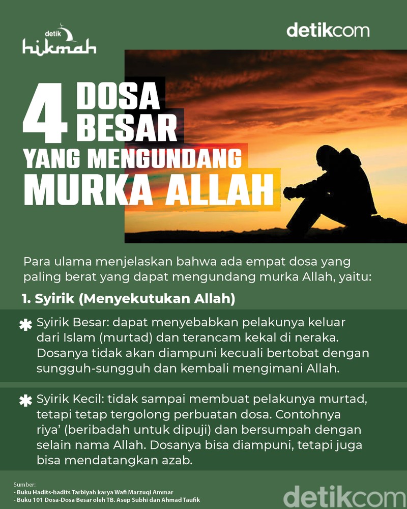 4 Jenis Dosa Besar yang Bikin Allah Murka, Ini Daftarnya BAGIKAN URL telah disalin Foto: detikHikmah Foto: detikHikmah Foto: detikHikmah