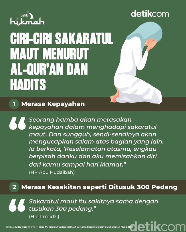 Jakarta - Sakaratul maut adalah fase paling berat yang akan dilalui setiap manusia menjelang ajal. Al-Qur'an dan hadits memberikan penjelasan tentang tanda-tandanya.